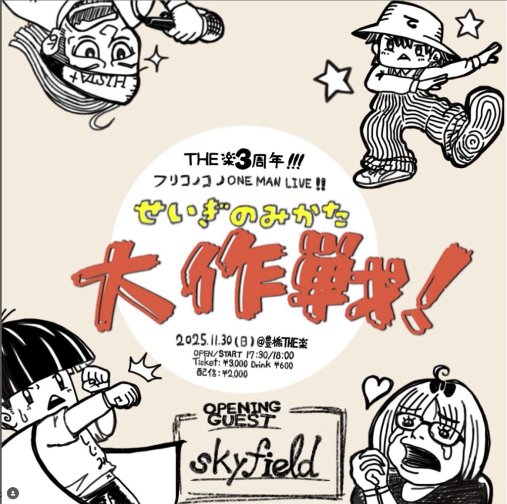弾き語りで活動するようになって最もお世話になっている"THE楽"の3周年イベント"フリコノコ ONE MAN LIVE せいぎのみかた大作戦!!"にオープニングでsky fieldで出演します!!